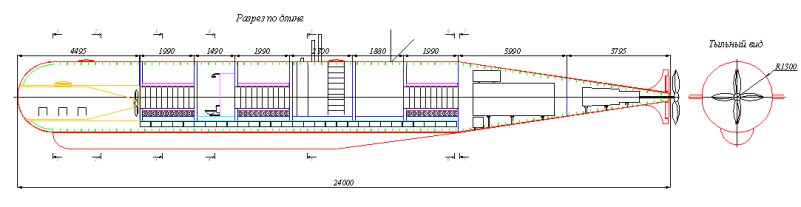 7. Восьмой и дявятый отсек не разделены перегородкой и в них расположены – баластная камера, дизель генератор переменного тока 330 кВт (может быть другой мощности), дизель генератор переменного тока 5 кВт, компресор высокого давления для заправки баллонов сжатого воздуха, компресор среднего давления 4 кВт, два водяных насоса, два водомета, главный всережимный двигатель постоянного тока с редуктором мощностью 300 кВт (может быть другой мощности), обеспечивающий обороты малошумного винта от 1 до 150 оборотов в минуту в любом направлении.